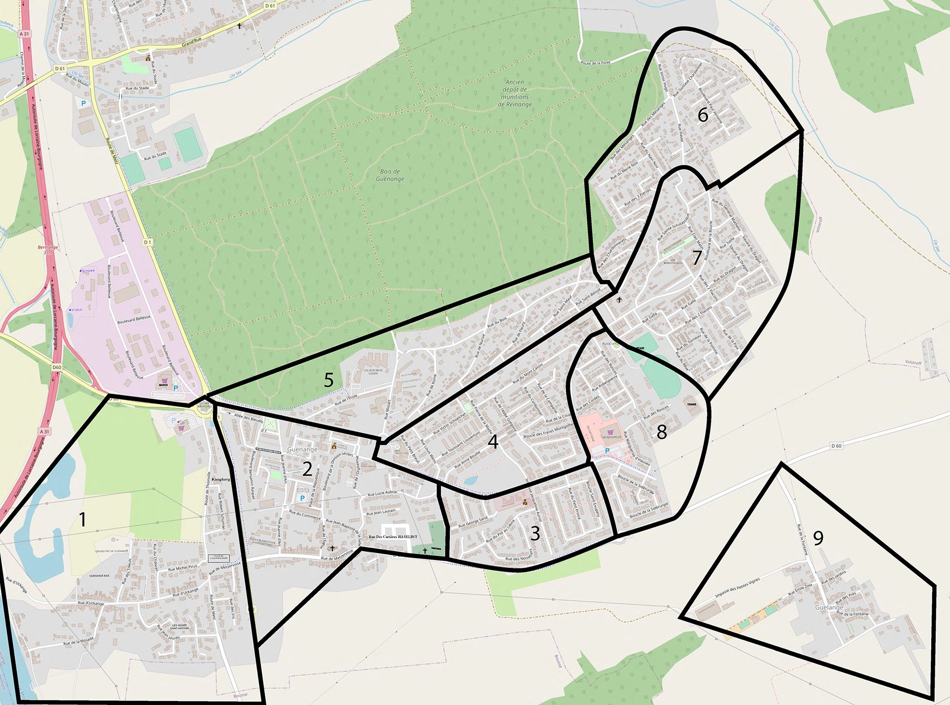 Afin de mieux accompagner les Guénangeois au quotidien, la municipalité a découpé fictivement la ville en 9 quartiers, dont chacun est représenté par un référent. Chaque problématique ou avis ou question peut être adressé au référent de quartier qui remonte directement l'information à la municipalité.