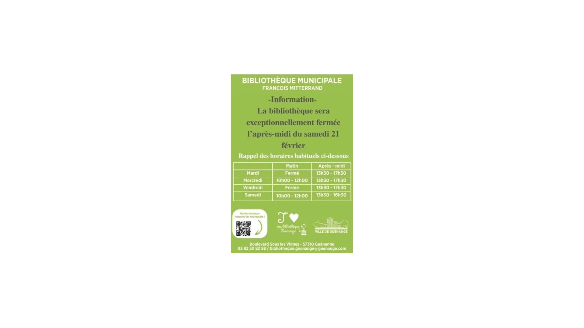 La Bibliothèque municipale François Mitterrand de Guénange fermera exceptionnellement ses portes ce samedi 21 février après-midi !