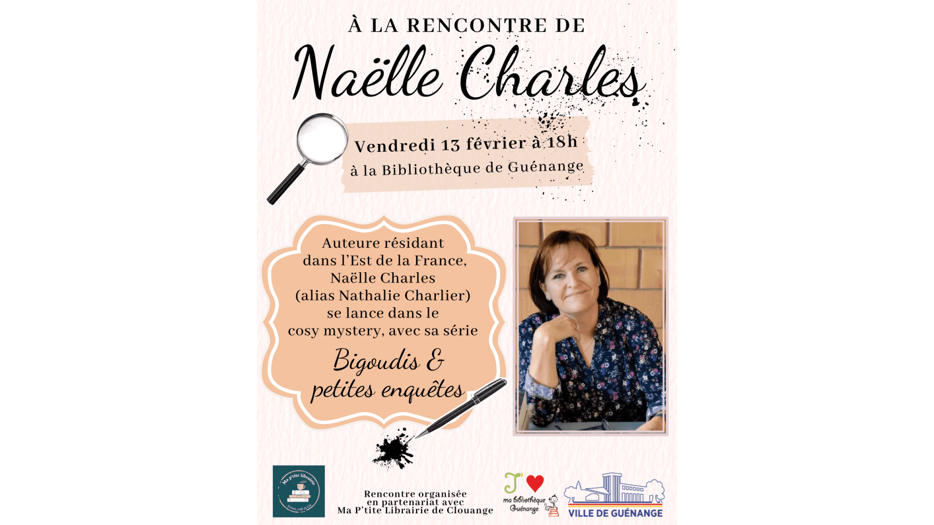 À la rencontre de Naëlle Charles (alias Nathalie Charlier), auteure résidant dans l'Est de la France et qui s'est lancée dans le cosy mystery avec sa série « Bigoudis & petites enquêtes ». Rencontre organisée en partenariat avec Ma P'tite Librairie de Clouange. Inscriptions conseillées.