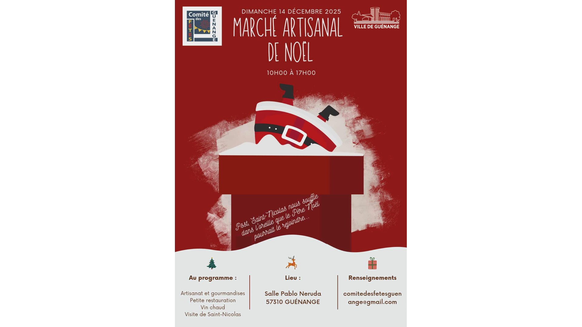 Marché artisanal de Noël - COMPLET POUR LES EXPOSANTS Visite de St Nicolas puis du Père-Noël Petite restauration