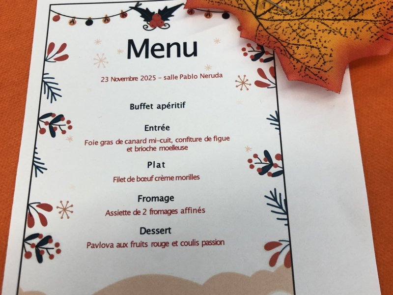 Comme chaque année, le Centre Communal d'Action Sociale (CCAS) a oeuvré à l'organisation du traditionnel repas des anciens, qui s'est déroulé dimanche 23 novembre, à la salle Pablo Neruda. Grâce à son soutien, ce rendez-vous incontournable a réuni 230 convives, dont 17 résidents de l'EHPAD, venus partager un moment chaleureux et festif.Le repas, préparé par AlacarteTraiteur, a débuté par un buffet apéritif très apprécié, avant de laisser place à un menu fin et gourmand :